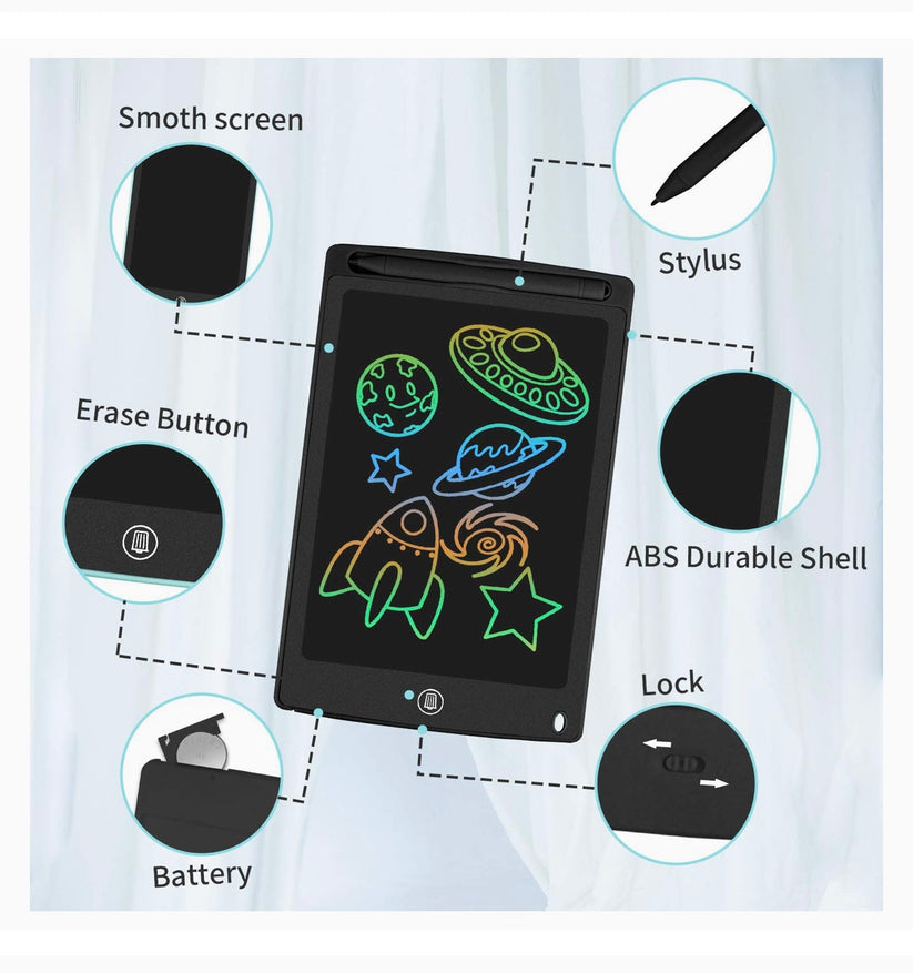Notre ardoise lcd est fournie avec un affichage coloré, une écriture très claire, un commutateur de verrouillage peut conserver ce que vous avez écrit, un bouton pour effacer tout l'écran, un stylet est adapté pour écrire dessus, un petit trou pour tenir la tablette la table, et une corde élastique que vous pouvez également sécuriser le stylo avec la tablette.
