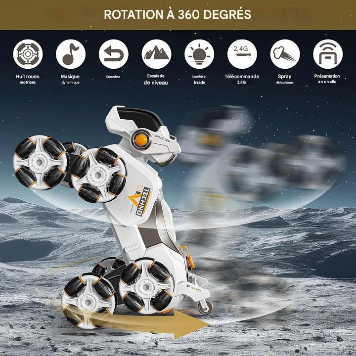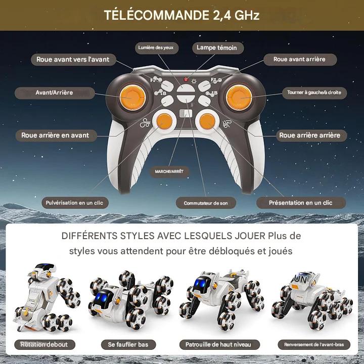 Voiture de cascade télécommandée 8WD : la voiture télécommandée pour chien robot 2,4 GHz est équipée de huit roues. Outre les mouvements de base vers l'avant et vers l'arrière, elle peut également effectuer facilement des virages à 360°, ramper, dériver et d'autres figures.